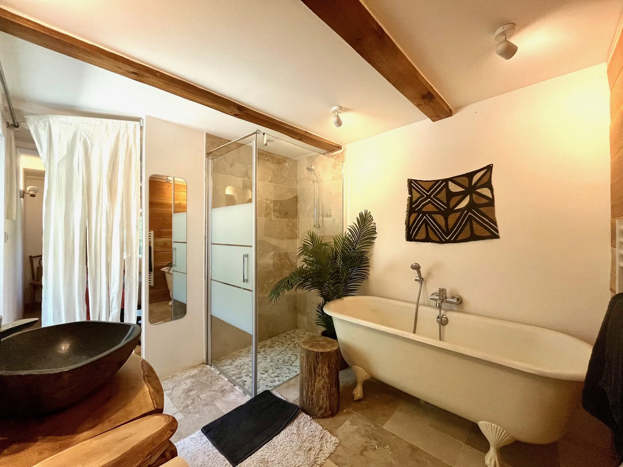Le Petit Gîte a une chambre double et une belle salle de bain avec une baignoire en fonte. Le gîte se loue à partir de 140€/nuit (min. 2 nuits) pour deux personnes.